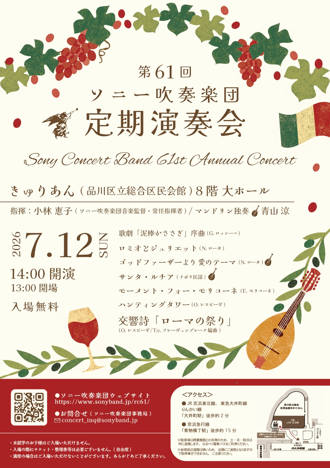第61回定期演奏会 ソニー吹奏楽団 第61回定期演奏会を開催いたします。 皆様のご来場を心よりお待ち申し上げております。 開催日: 2026年7月12日(日) 会場: きゅりあん(品川区立総合区民会館)・大ホール JR京浜東北線・東急大井町線・りんかい線 「大井町駅」 徒歩約2分 入場料:無料 入場の際にチケット・整理券は必要ございません(自由席) FacebookX